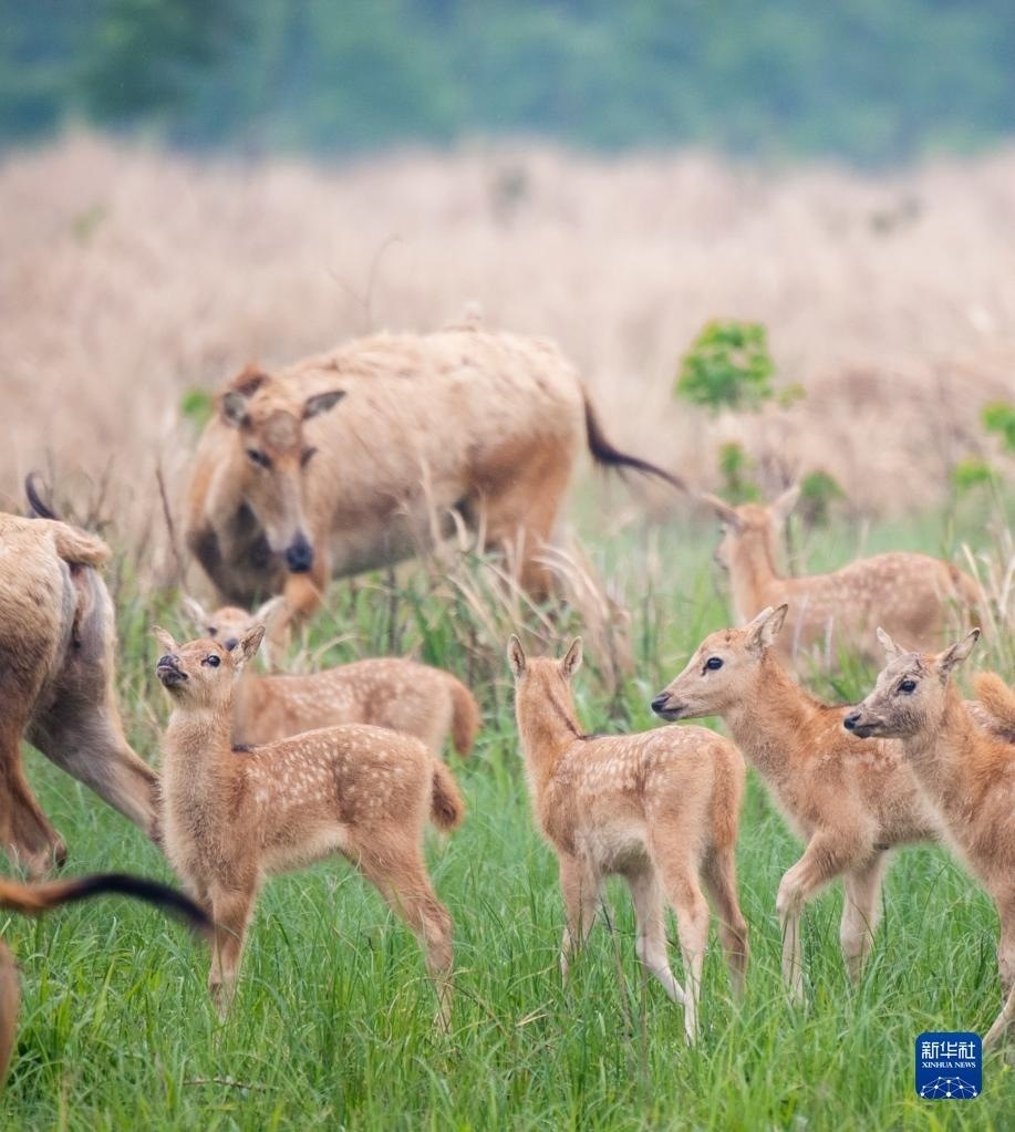 4月28日,一群麋鹿帶著幼鹿在石首麋鹿國(guó)家級(jí)自然保護(hù)區(qū)活動(dòng)。孕期母鹿通常會(huì)選擇較為隱蔽的地方獨(dú)自待產(chǎn)。剛出生的幼鹿體格較弱,母鹿一般會(huì)獨(dú)自喂養(yǎng)約一周后再將其帶回鹿群。   新華社記者 伍志尊 攝