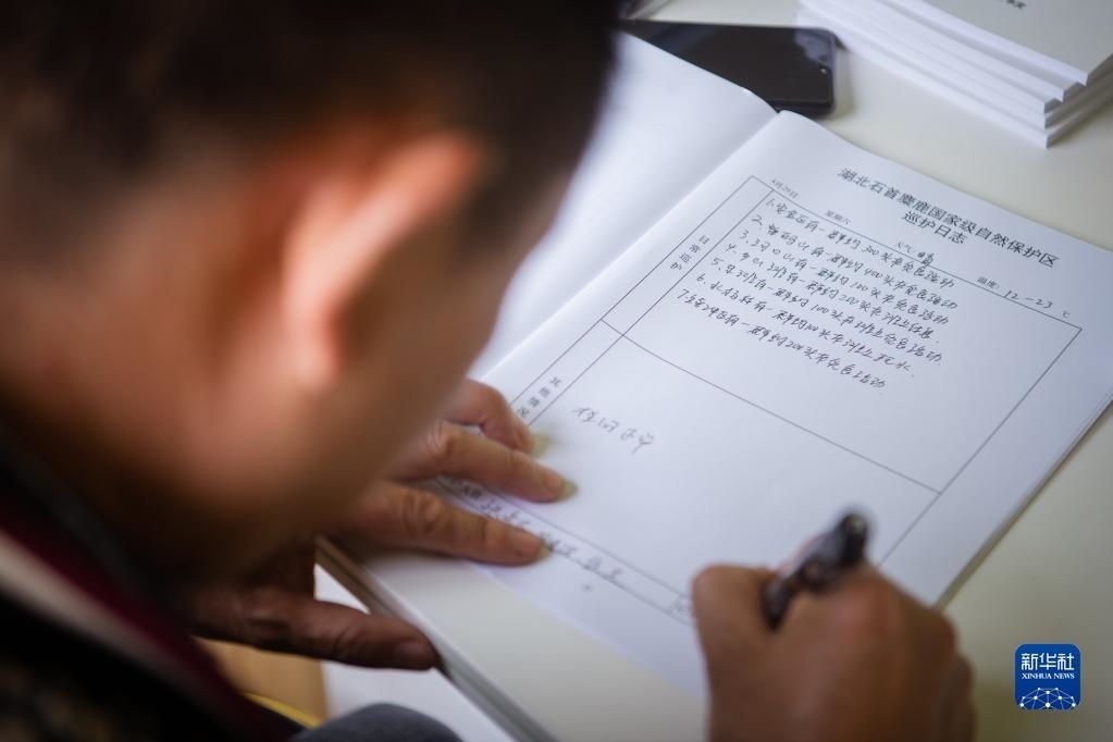 4月29日,在石首麋鹿國(guó)家級(jí)自然保護(hù)區(qū),巡護(hù)員劉吉高填寫巡護(hù)日志。   新華社記者 伍志尊 攝