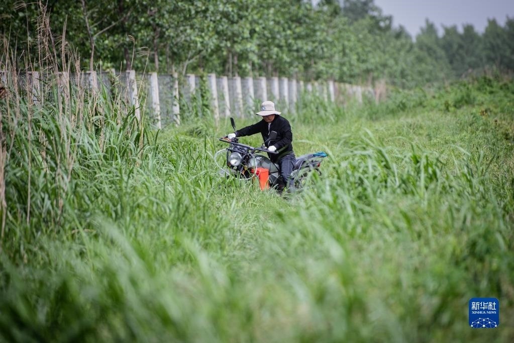 4月29日,在石首麋鹿國(guó)家級(jí)自然保護(hù)區(qū),巡護(hù)員王傳軍騎車在齊腰高的野草中巡邏。   新華社記者 伍志尊 攝