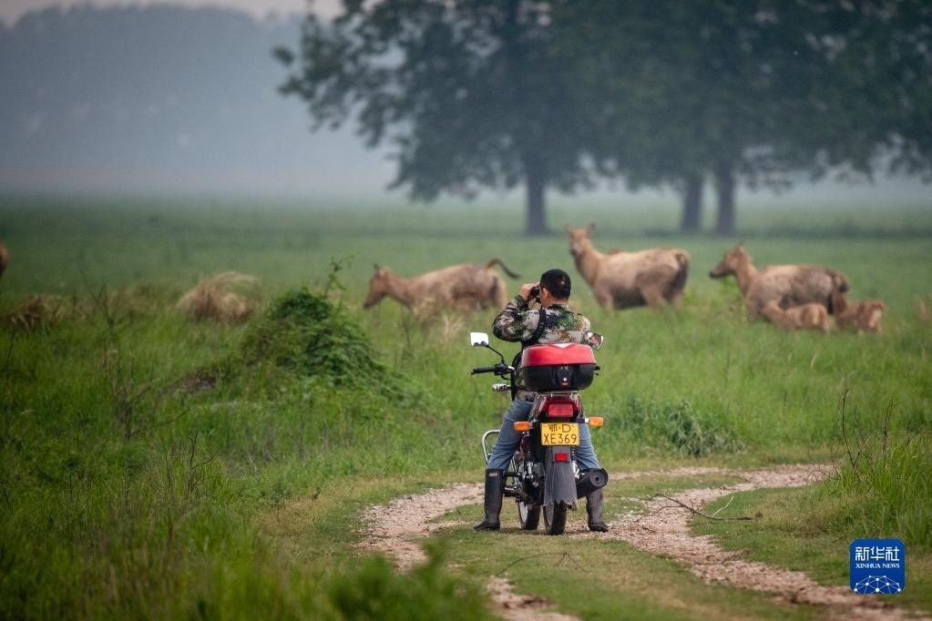 4月28日,在石首麋鹿國(guó)家級(jí)自然保護(hù)區(qū),巡護(hù)員劉吉高觀測(cè)遠(yuǎn)處的一群麋鹿。   新華社記者 伍志尊 攝