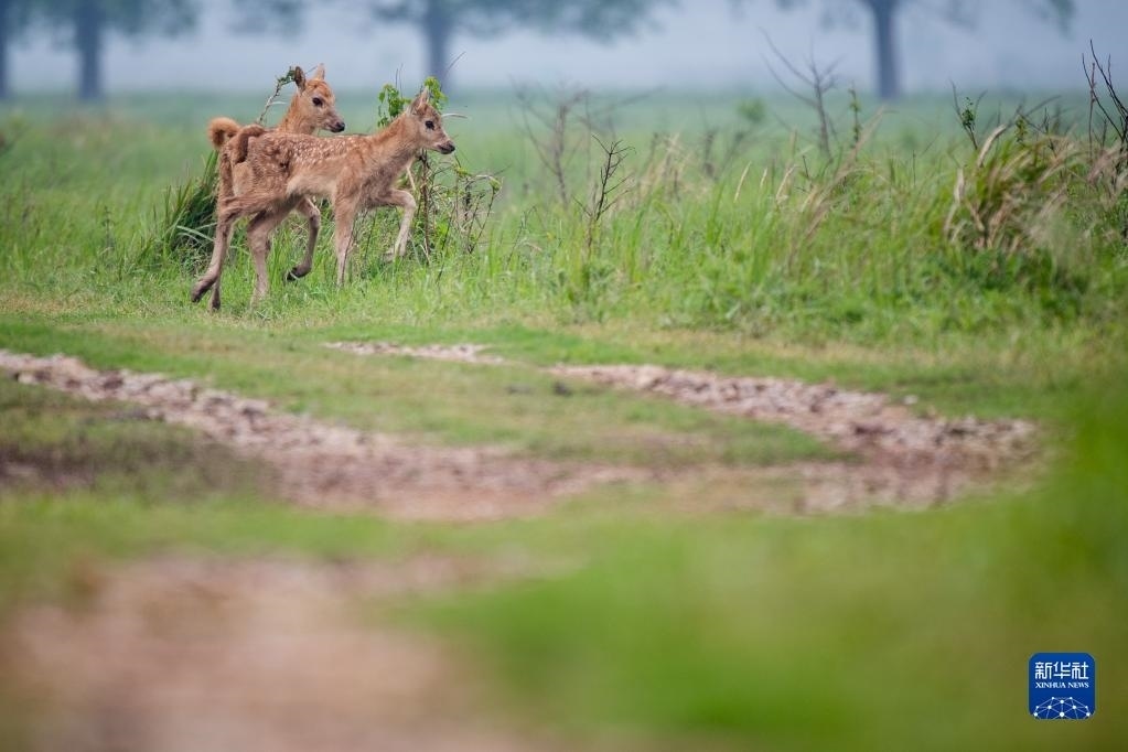 4月28日,幾頭幼鹿跟隨麋鹿群在石首麋鹿國(guó)家級(jí)自然保護(hù)區(qū)內(nèi)活動(dòng)。   新華社記者 伍志尊 攝