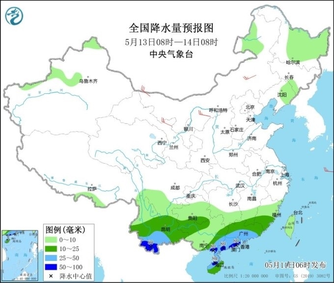 預(yù)計(jì)未來三天(11日至13日),華南地區(qū)仍有較強(qiáng)降雨,廣西、廣東、海南島等地大部地區(qū)日雨量有中到大雨,局地暴雨或大暴雨;此外,云南中南部有中到大雨,局地暴雨。