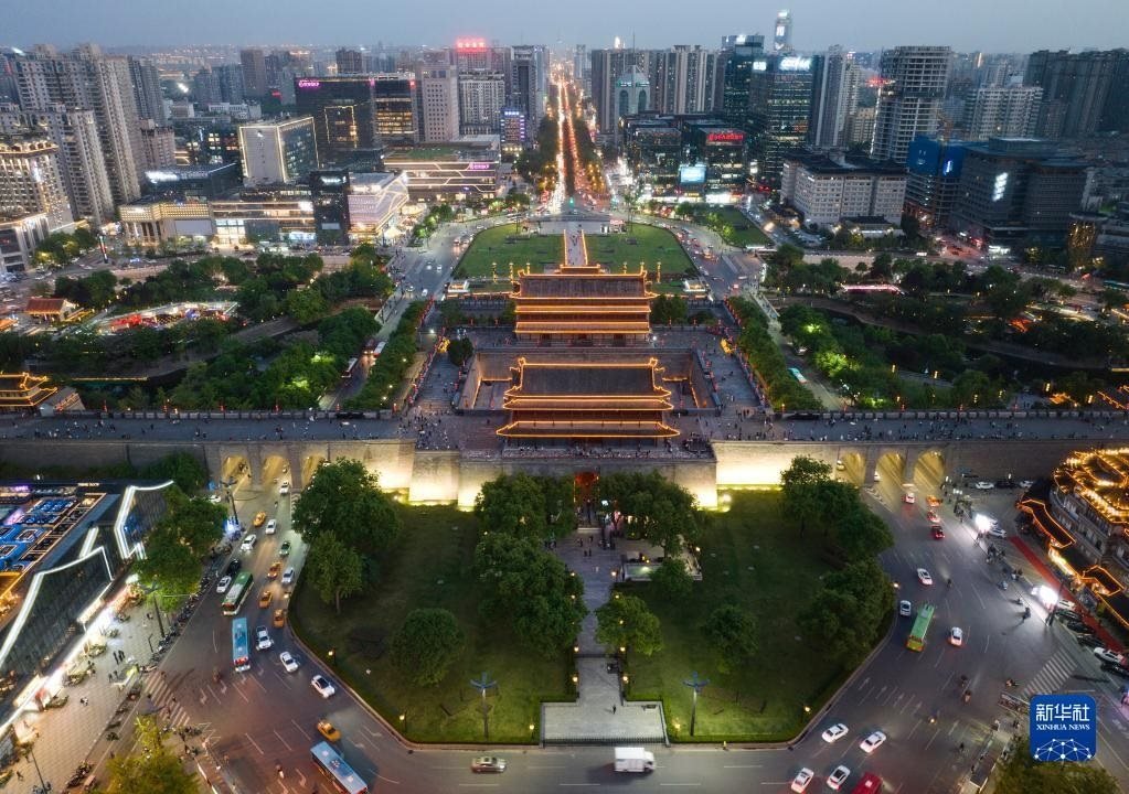 夜色下的西安城墻永寧門及周邊商圈(4月25日攝,無(wú)人機(jī)照片)。