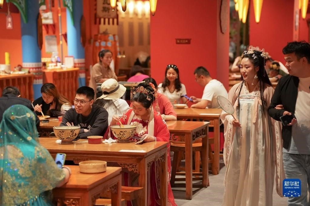 5月11日,游客在西安“長(zhǎng)安十二時(shí)辰”主題街區(qū)內(nèi)用餐。