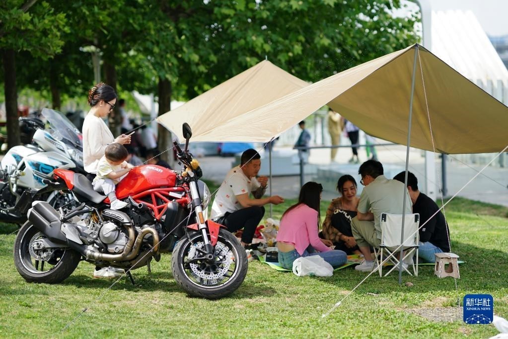 市民在西安灞河岸邊的公園內(nèi)露營(yíng)休閑(2022年5月15日攝)。