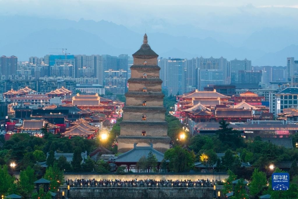 西安大雁塔及其身后的大唐不夜城街區(qū)(5月8日攝)。