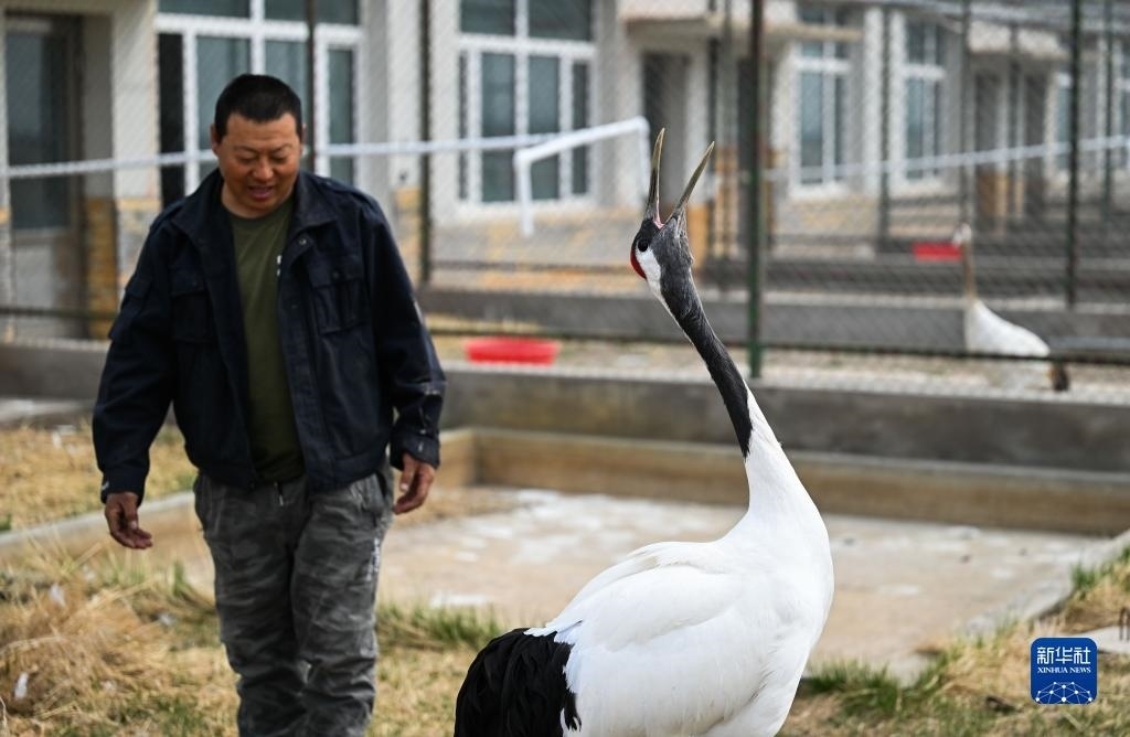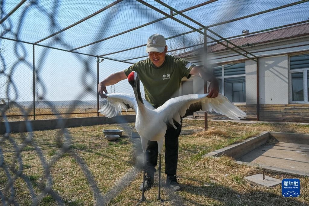 5月10日,徐沃德樂胡幫助一只救助的丹頂鶴張開翅膀。
