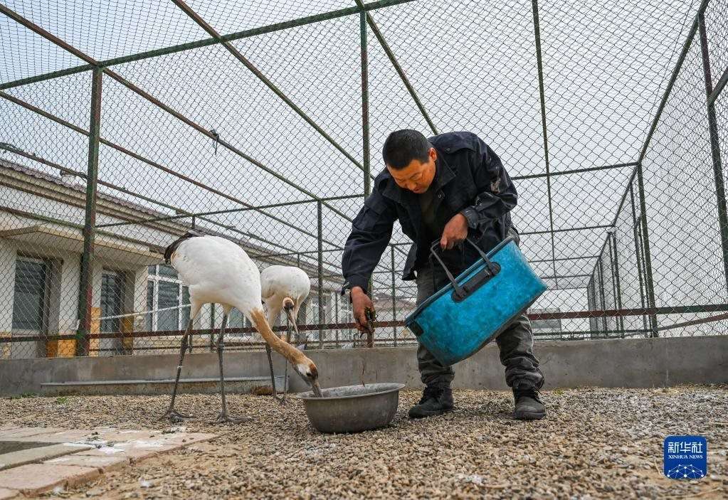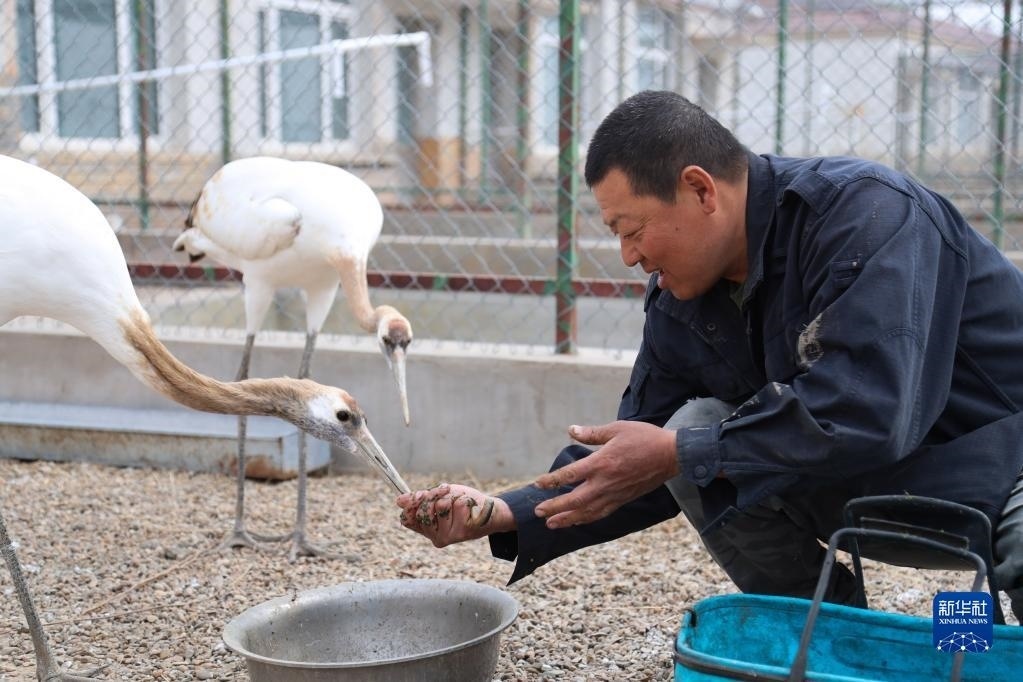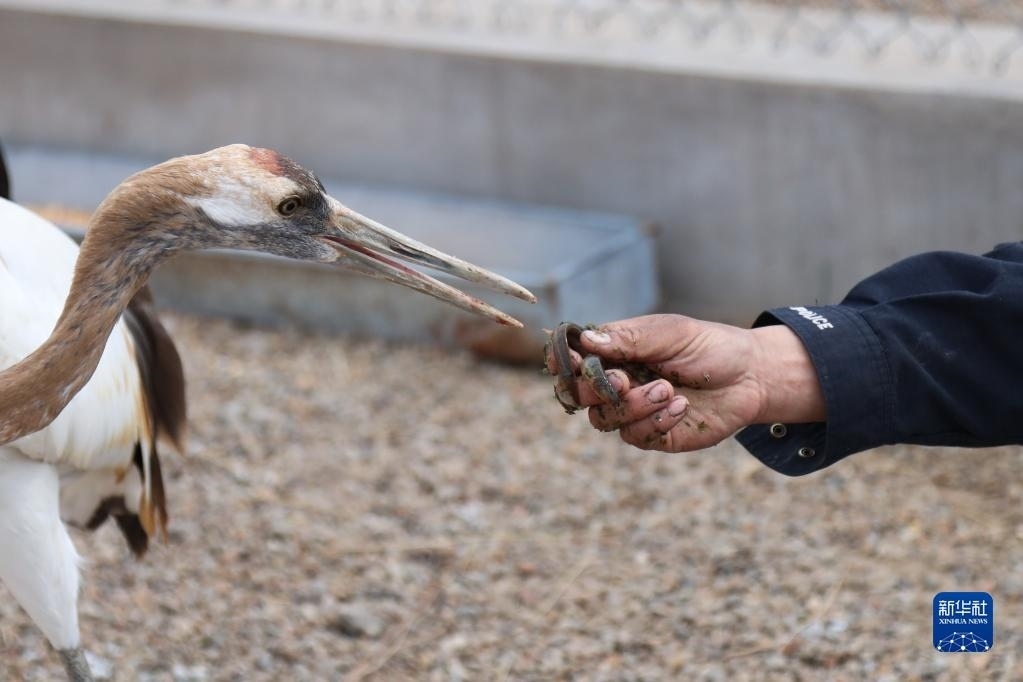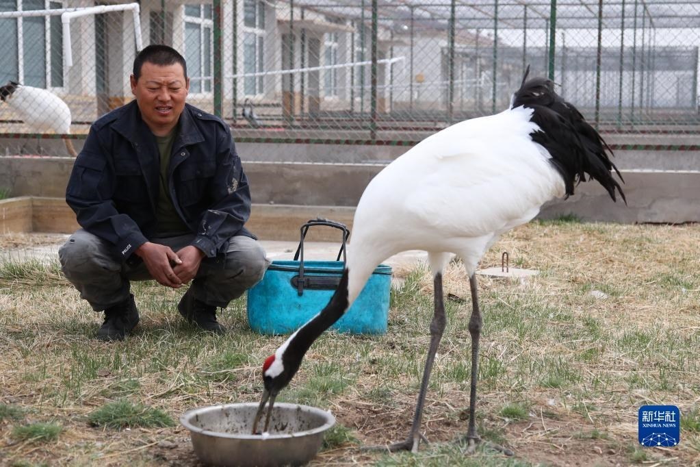 5月11日,徐沃德樂胡在觀察救助的丹頂鶴進食。