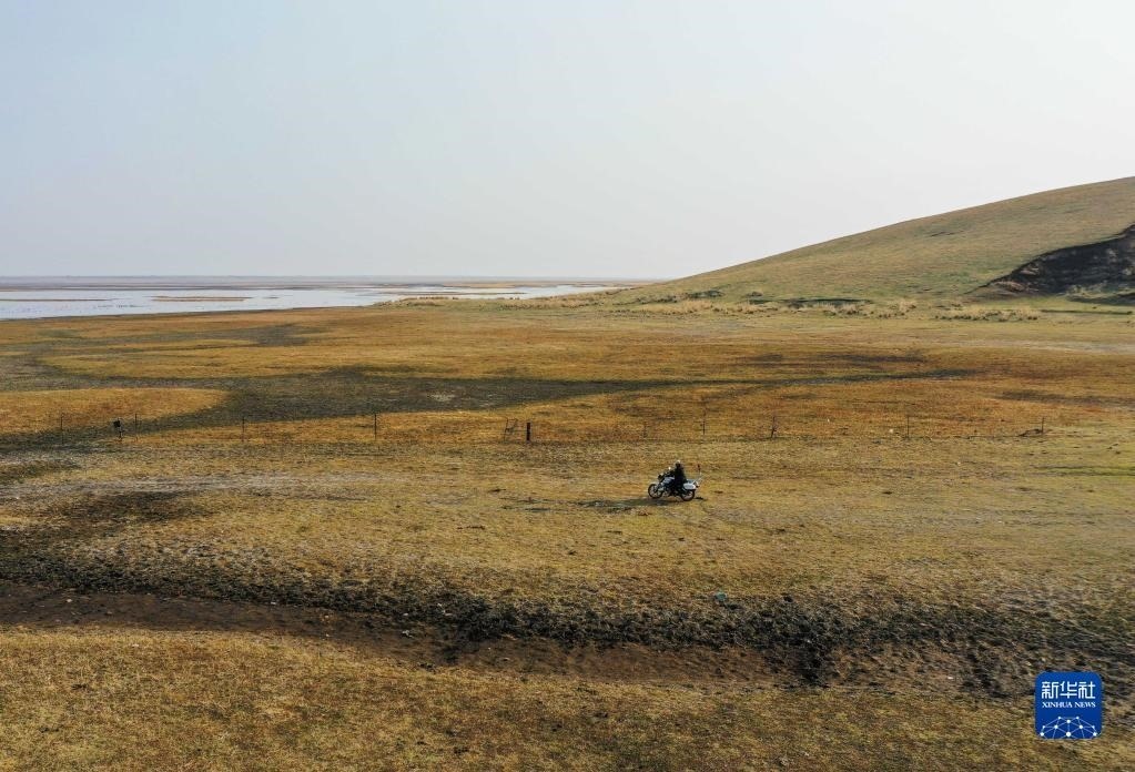 5月10日,徐沃德樂胡騎著摩托在管護站附近巡護(無人機照片)。