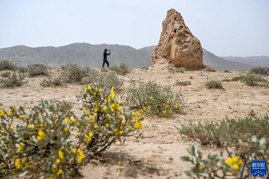 5月13日,駝峰(長(zhǎng)城)文物保護(hù)隊(duì)員布音烏力吉在阿拉善左旗一處烽火臺(tái)遺址巡查并拍照記錄。