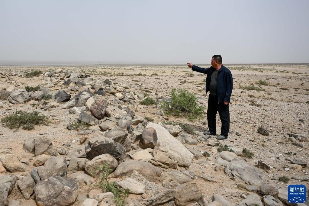 5月13日,駝峰(長(zhǎng)城)文物保護(hù)隊(duì)員布音烏力吉在觀察阿拉善左旗一處烽火臺(tái)遺址表面,查看是否有人為破壞痕跡。