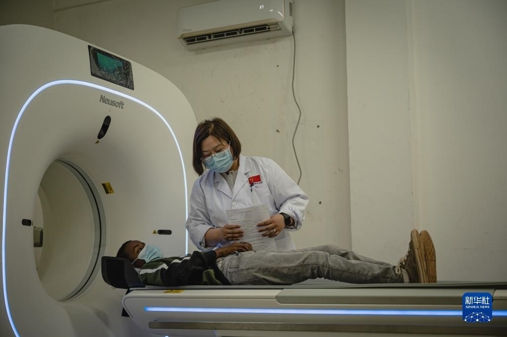 5月9日,在厄立特里亞首都阿斯馬拉的奧羅特醫(yī)院,醫(yī)療隊CT室醫(yī)生田茜為患者做檢查。