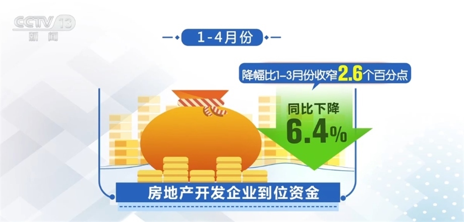 從房企資金看,受到市場銷售改善影響,房地產(chǎn)開發(fā)企業(yè)資金緊張狀況有所緩解,1—4月份,房地產(chǎn)開發(fā)企業(yè)到位資金同比下降6.4%,降幅比1—3月份收窄2.6個百分點(diǎn)。
