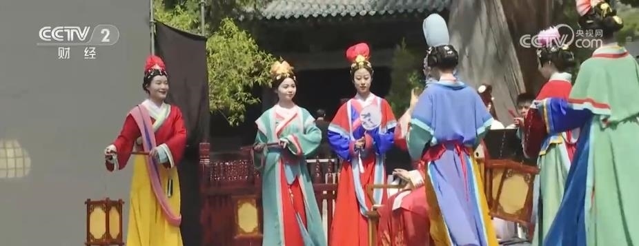 在晉祠的標志性建筑圣母殿前,一場場穿越古今的表演登臺亮相?!稌x祠十二時辰》由晉祠講解員自行編排而成,生動還原了圣母殿內人物的一天。從服飾裝扮到生活起居,她們用舞蹈讓雕塑“活”了起來,也使游客從別樣的角度領略了圣母殿折射出的文化魅力。