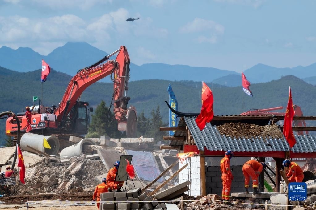 5月16日,參演人員在麗江演習(xí)現(xiàn)場對受損建筑物進行排險加固。