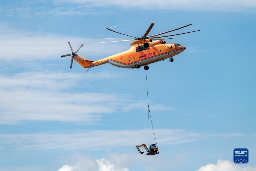 5月16日,一架參演直升機在麗江演習(xí)現(xiàn)場上空轉(zhuǎn)運一臺挖掘機。   新華社記者 陳欣波 攝