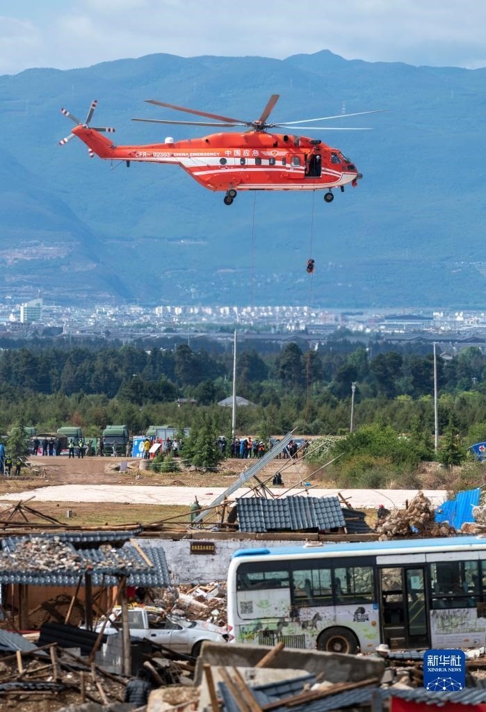 當(dāng)日,國務(wù)院抗震救災(zāi)指揮部辦公室、應(yīng)急管理部、云南省人民政府在云南麗江等地聯(lián)合舉行高山峽谷地區(qū)地震災(zāi)害空地一體化聯(lián)合救援演習(xí),代號“應(yīng)急使命·2023”。   新華社記者 陳欣波 攝