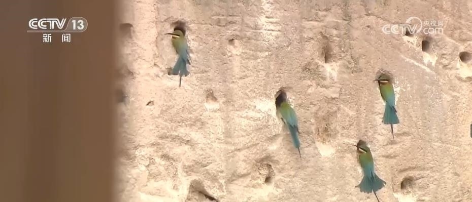 眼前,這些看上去很像是泥巴墻的建筑,其實是人工建造的候鳥巢穴。根據(jù)栗喉蜂虎的生活習(xí)慣,保護區(qū)工作人員專門在它們回來之前就對懸壁進行修整,讓這些美麗的小鳥更方便安家。