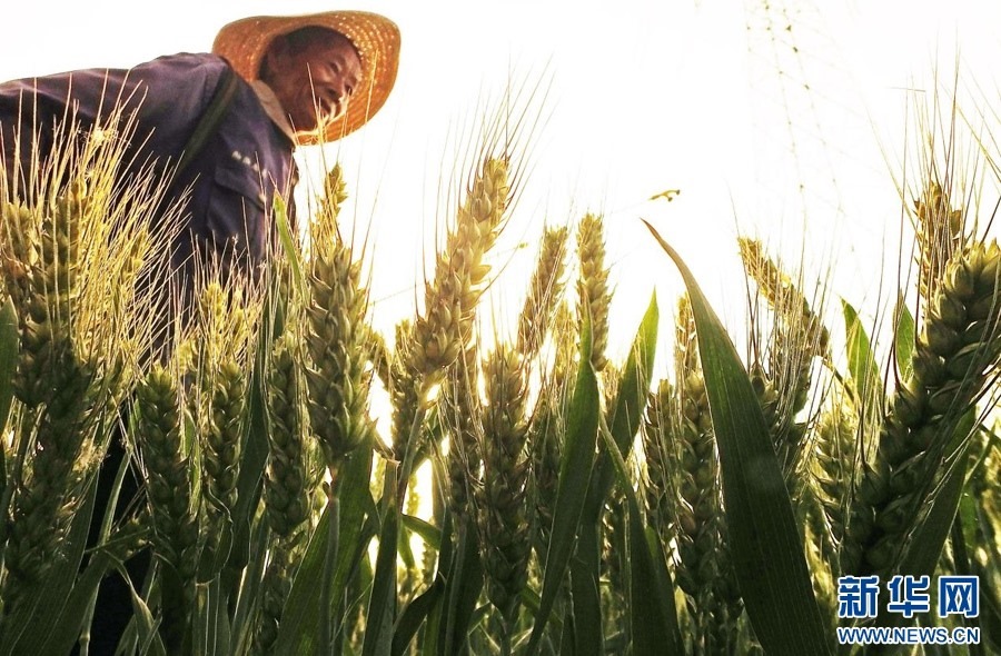 ??夕陽下,麥農(nóng)察看小麥長勢(shì)。新華網(wǎng) 發(fā)(高新生 攝)??