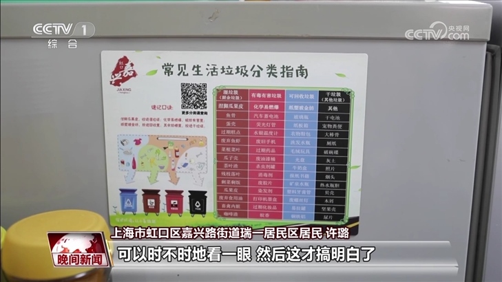 上海市虹口區(qū)嘉興路街道瑞一居民區(qū)居民 許璐:剛開(kāi)始我們也搞不明白什么算是濕垃圾,什么算是干垃圾,然后看了小冊(cè)子,看了一些廣告,看還有冰箱貼,天天貼著那個(gè)上頭,可以時(shí)不時(shí)地看一眼,然后這才搞明白了。