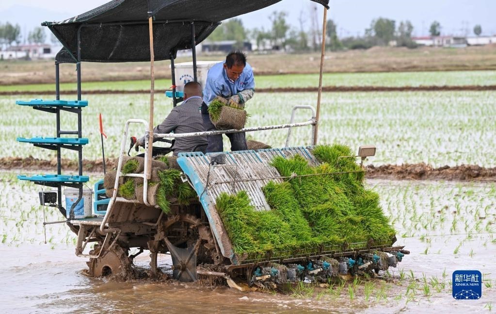 5月23日,達(dá)拉特旗昭君鎮(zhèn)村民在鹽堿地改良水稻田中使用農(nóng)機(jī)插秧。