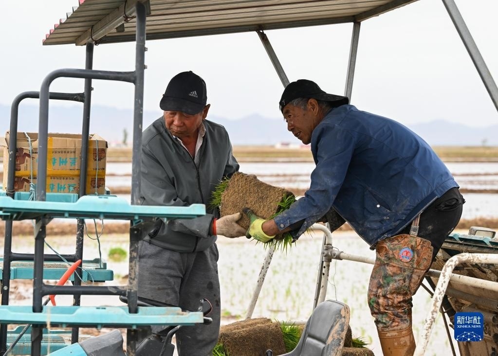 5月23日,達(dá)拉特旗昭君鎮(zhèn)村民在為農(nóng)機(jī)添加秧苗。