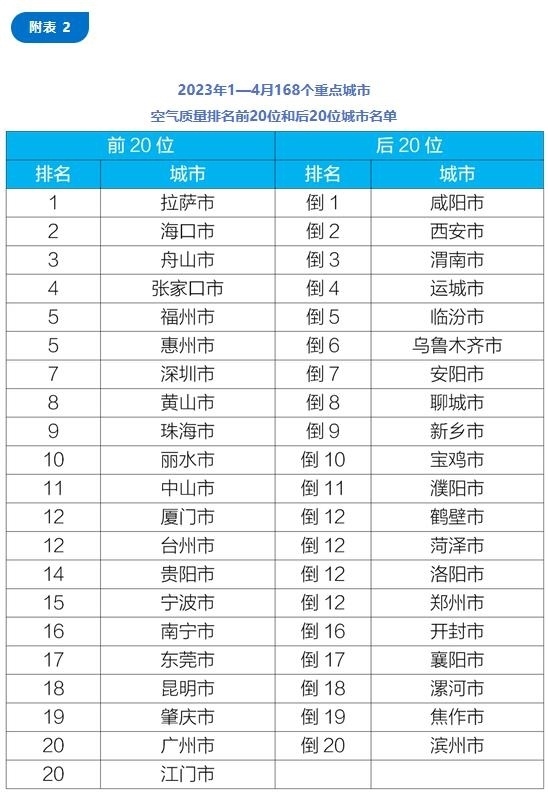 1—4月,168個(gè)重點(diǎn)城市中,拉薩、??诤椭凵降瘸鞘锌諝赓|(zhì)量相對(duì)較好(從第1名至并列第20名);咸陽、西安和渭南等城市空氣質(zhì)量相對(duì)較差(從倒數(shù)第1名至倒數(shù)第20名)。