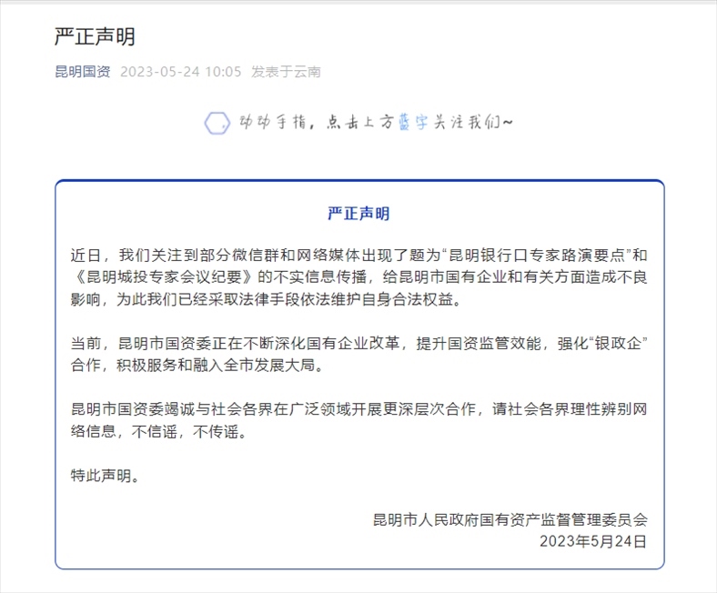 ·昆明市國資委發(fā)布聲明,“昆明銀行口專家路演要點”和《昆明城投專家會議紀要》不實。