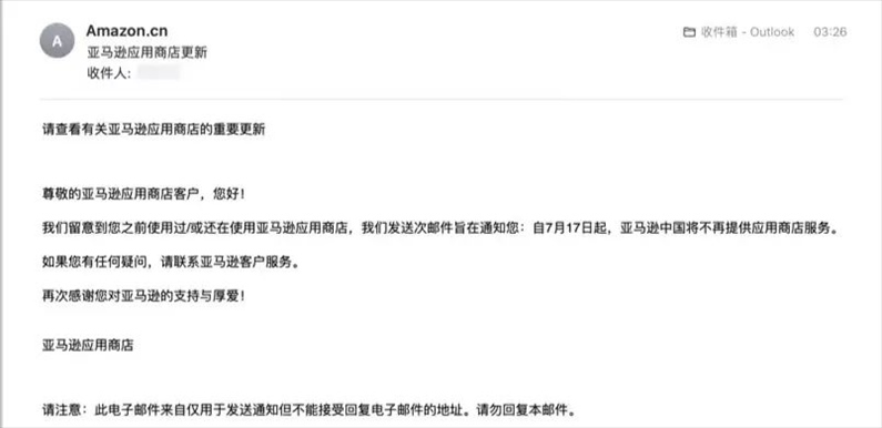 ·亞馬遜應用商店發(fā)送郵件提醒稱,自7月17日起亞馬遜中國將不再提供應用商店服務。