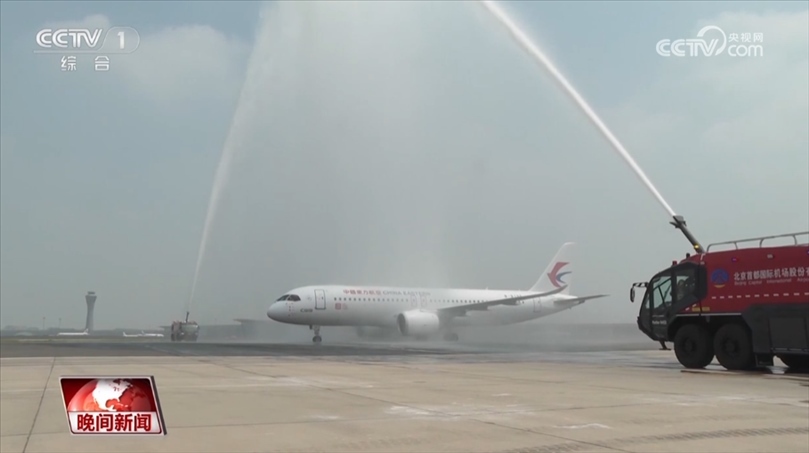 12時(shí)31分,C919順利降落在北京首都機(jī)場,并穿過象征民航最高禮儀的“水門”。130多名首航旅客率先體驗(yàn)乘坐了國產(chǎn)大飛機(jī)出行。