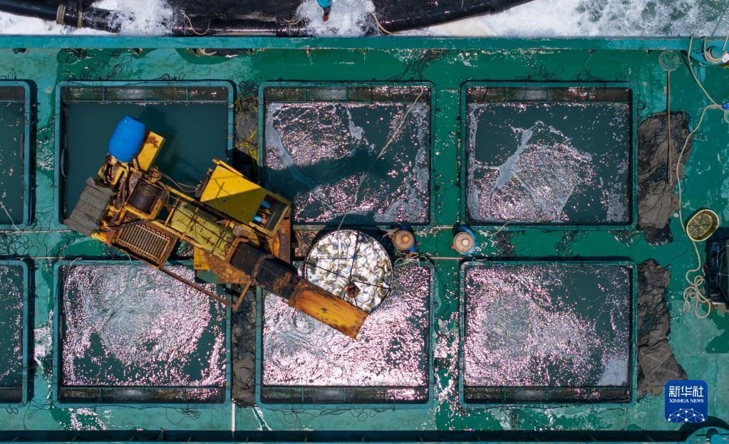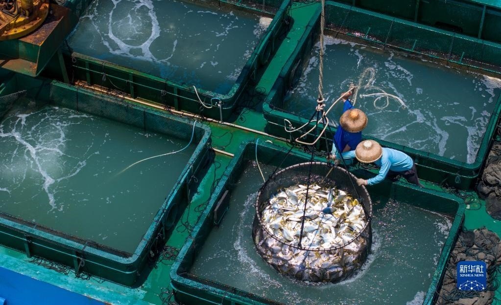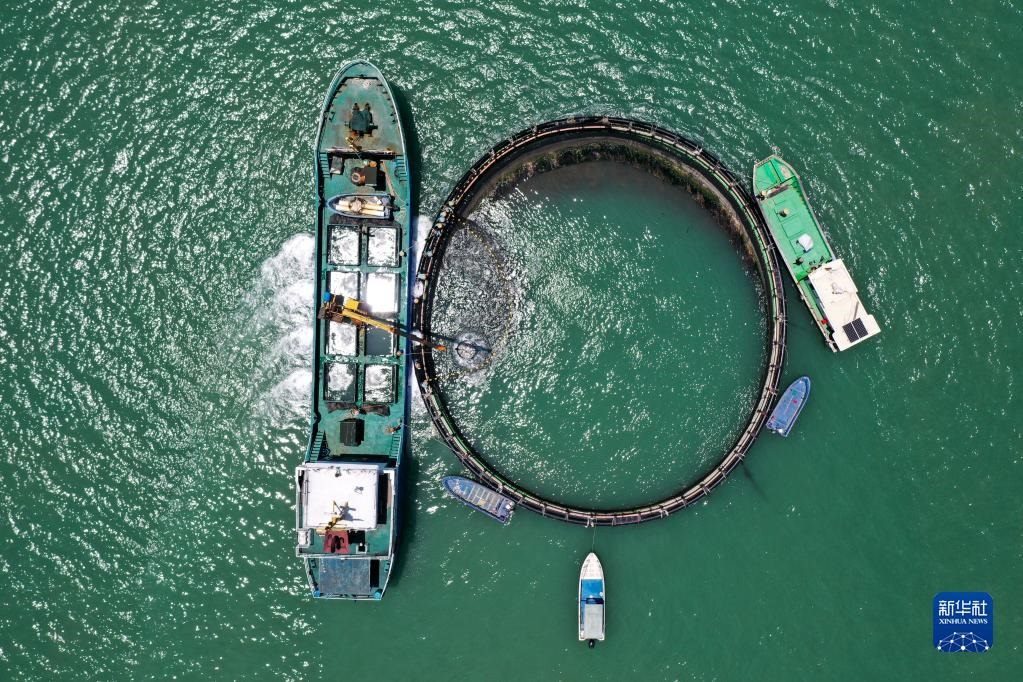 廣東省湛江市是全國(guó)最大的金鯧魚(yú)養(yǎng)殖基地之一,被譽(yù)為“中國(guó)金鯧魚(yú)之都”。在深藍(lán)色海面上,整齊分布著一串串100米左右周長(zhǎng)的深海網(wǎng)箱,孕育著被譽(yù)為“黃金魚(yú)”的金鯧魚(yú),年產(chǎn)量約10萬(wàn)噸,約占全國(guó)產(chǎn)量三到四成,除了供應(yīng)中國(guó)市場(chǎng),還出口到美國(guó)、印度、馬來(lái)西亞等國(guó)家和地區(qū)。隨著近年金鯧魚(yú)深海養(yǎng)殖規(guī)?;?、集群化、市場(chǎng)化步伐加快,小小“黃金魚(yú)”每年可創(chuàng)造百億元產(chǎn)值。   新華社記者 盧漢欣 攝