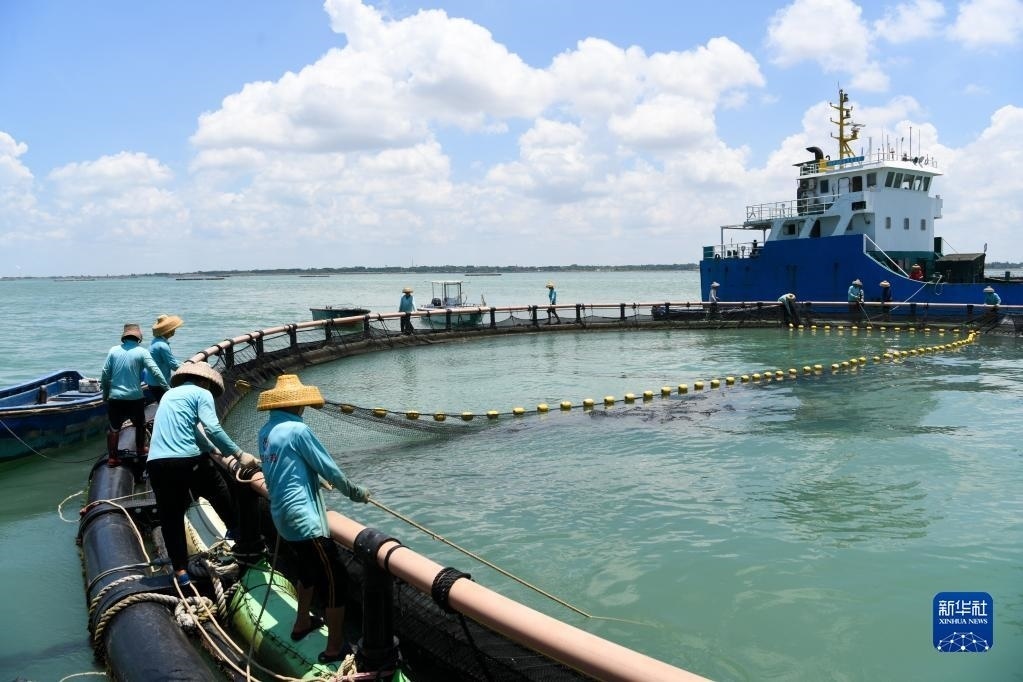 5月27日,在湛江市徐聞縣西連鎮(zhèn),漁業(yè)工人在深海網(wǎng)箱拉網(wǎng)收獲金鯧魚(yú)。   新華社記者 梁旭 攝
