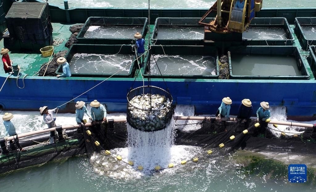 5月27日,在湛江市徐聞縣西連鎮(zhèn),漁業(yè)工人從徐聞國(guó)橋深海養(yǎng)殖有限公司的金鯧魚(yú)深海網(wǎng)箱捕魚(yú)(無(wú)人機(jī)照片)。