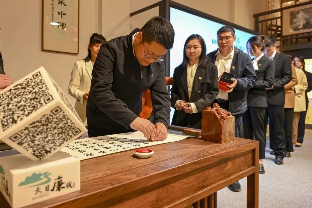 杭州市臨安區(qū)深入挖掘印信文化中的廉潔元素,開展一諾“清”心的“蓋廉印”廉政教育活動,組織轄區(qū)年輕干部刻印一枚署有自己名字的“專屬”印章,許下“履職第一諾”,以滿滿的儀式感厚植廉潔理念。圖為臨安區(qū)昌化鎮(zhèn)年輕干部珍重蓋上自己的“清廉印”,許下“廉潔諾”。任曉東 攝
