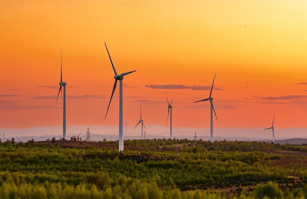5月23日清晨拍攝的興安盟烏蘭浩特市呼和馬場風力光伏發(fā)電場內(nèi)的風機。新華社發(fā)(王正攝)