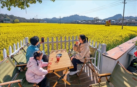 杭州市臨安區(qū)太陽(yáng)鎮(zhèn)太陽(yáng)米基地旁的一家民宿餐廳,客人在院子里喝茶賞景(2023年3月28日攝)徐昱攝/本刊