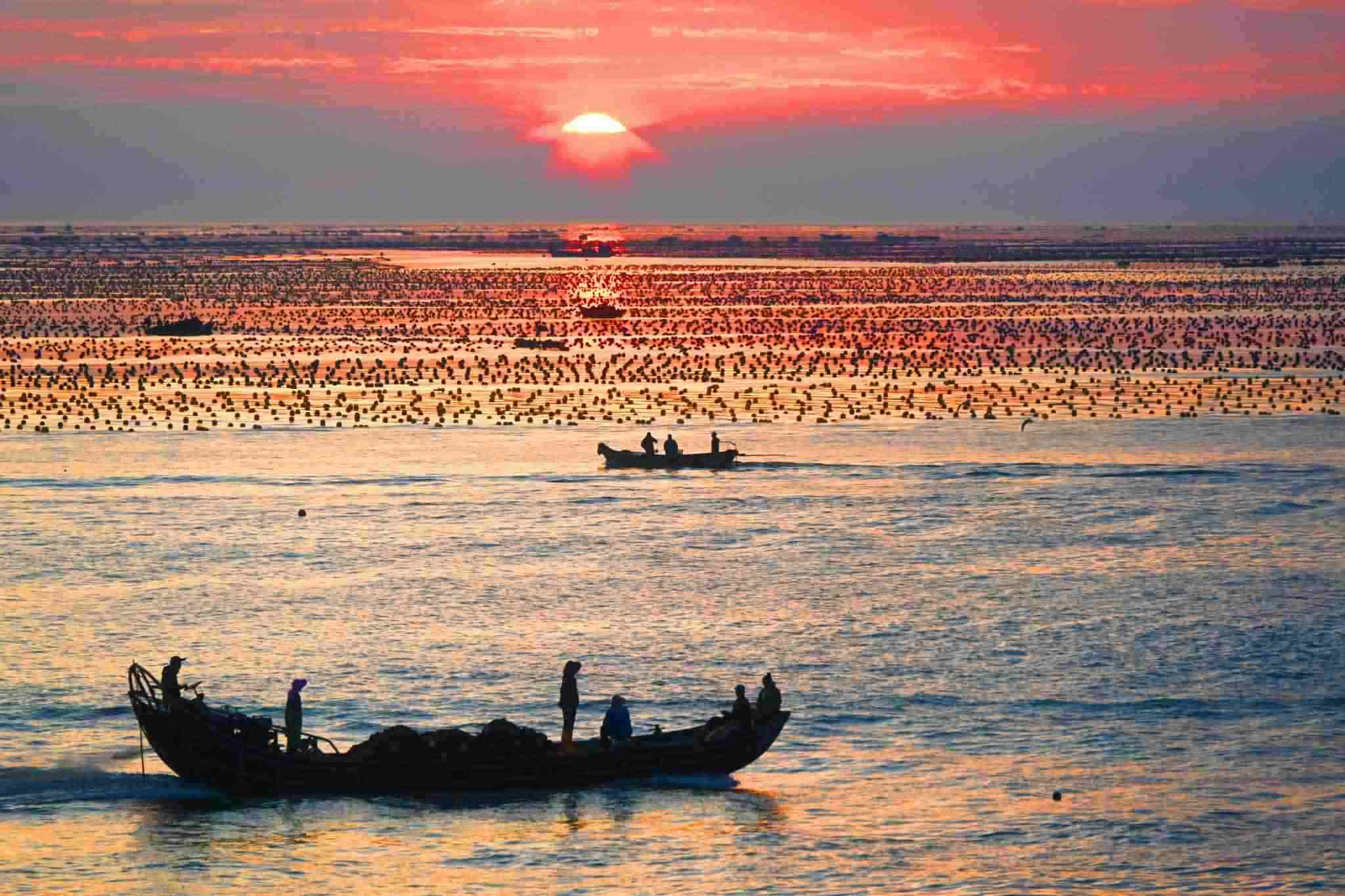 2023年5月31日,山東威海,榮成愛倫灣海洋牧場(chǎng),漁民駕駛船只在海上收獲海帶,美麗的朝霞倒影在海上,海鷗伴舞,海洋牧場(chǎng)到處呈現(xiàn)一派豐收的喜人景象。視覺中國