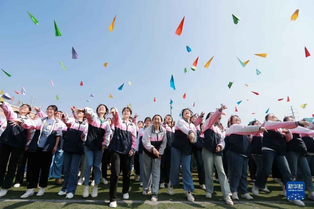 5月31日,在淮北市第十二中學(xué),高三學(xué)生在操場上扔紙飛機。