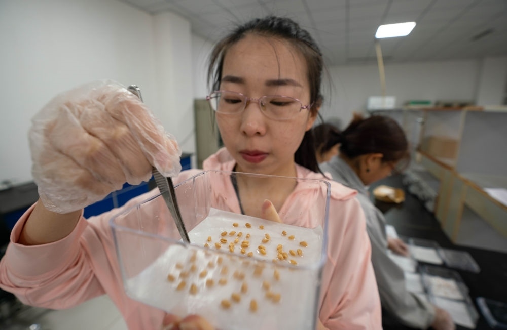 5月25日,在河北滄州渤海新區(qū)黃驊市中捷產(chǎn)業(yè)園區(qū)農(nóng)科所種子檢驗室,技術(shù)人員在做小麥出芽率實驗。新華社記者 駱學(xué)峰 攝