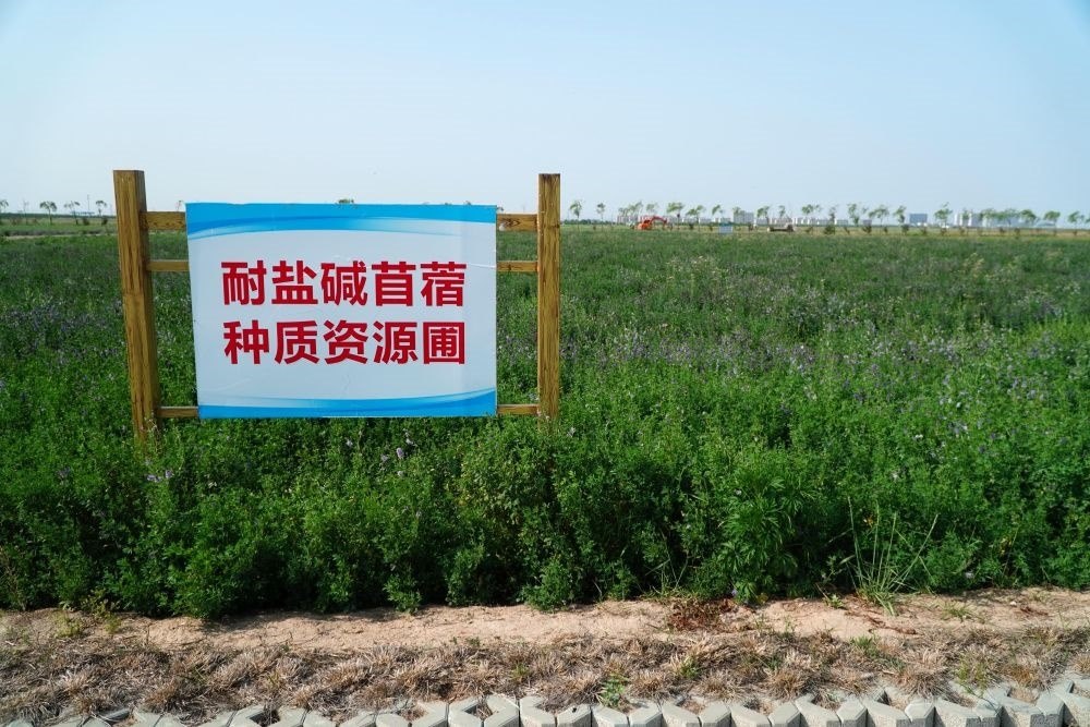 5月19日,位于山東省東營市黃河三角洲農(nóng)業(yè)高新技術(shù)產(chǎn)業(yè)示范區(qū)的耐鹽堿苜蓿種質(zhì)資源圃。新華社記者 徐速繪 攝