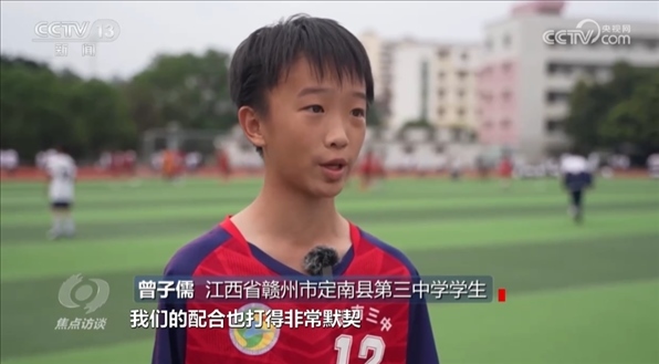 江西省贛州市定南縣第三中學(xué)學(xué)生曾子儒:“踢足球之前自己體弱多病,身體素質(zhì)比較差,別提去踢這么一場激烈的足球比賽,就是讓我圍著操場跑一圈都?xì)獯跤酢!?br>