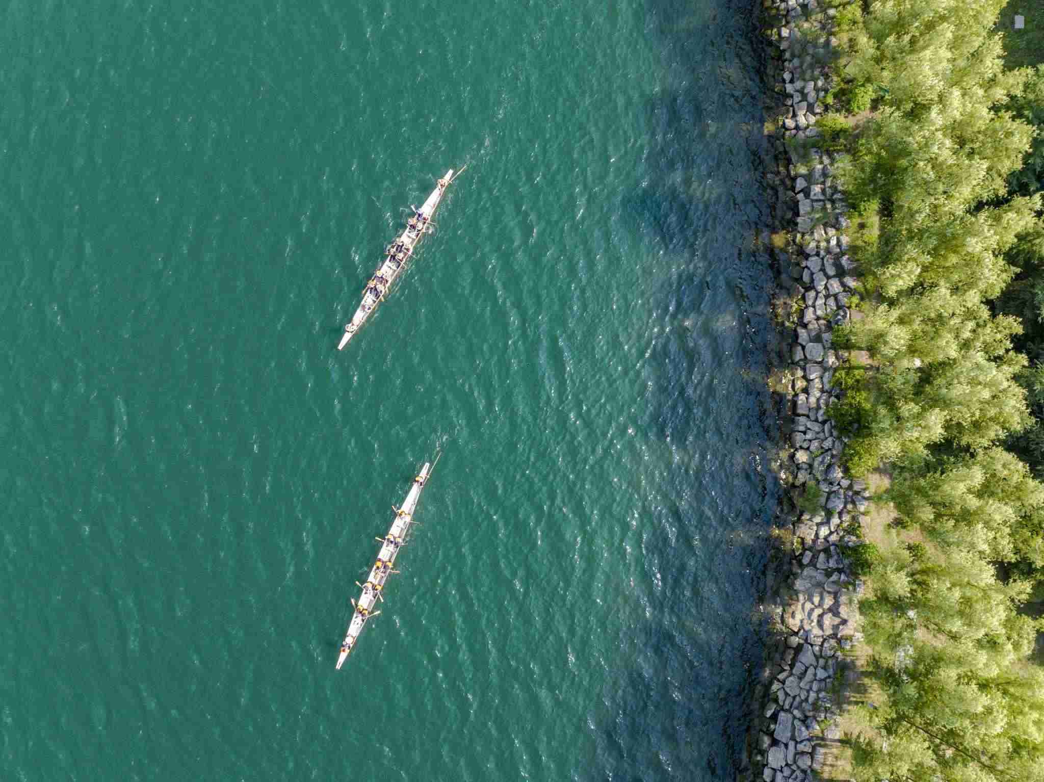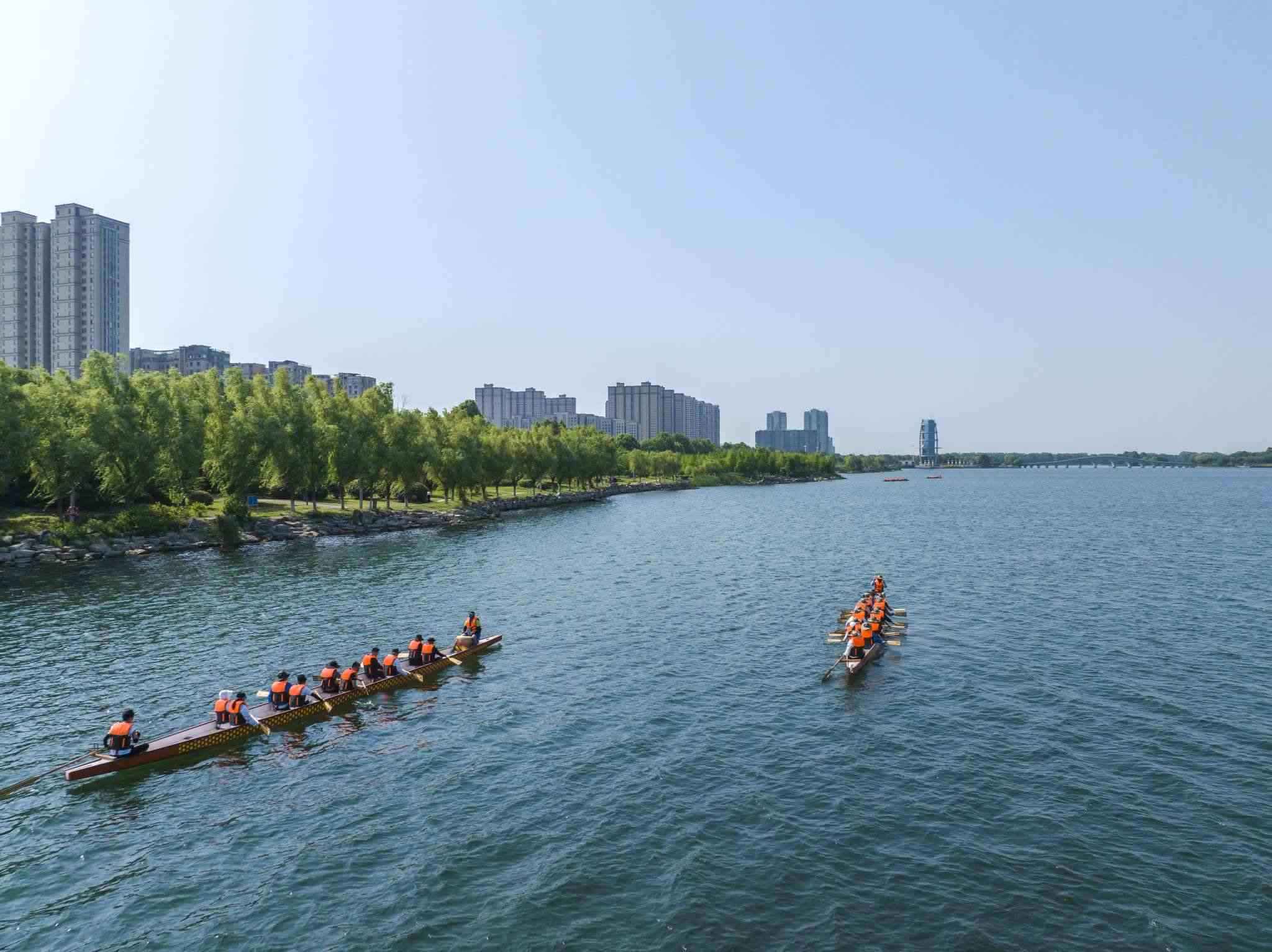 2023年6月8日,江蘇連云港,東??h西雙湖風景區(qū),多支龍舟隊在西雙湖水域進行訓練,積極備戰(zhàn)端午龍舟賽。視覺中國