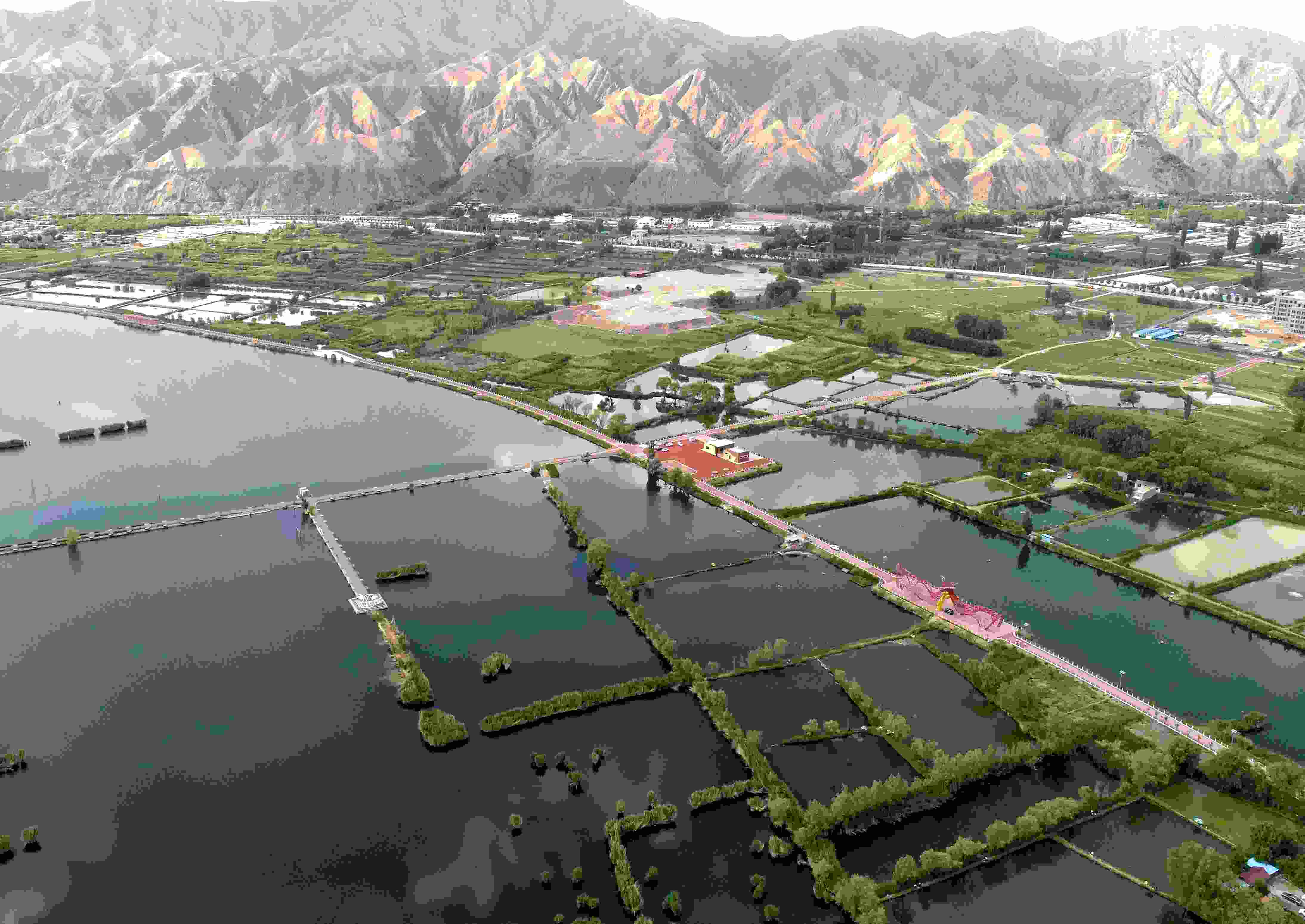 初夏時節(jié),甘肅省永靖縣太極島黃河濕地風光秀麗,島上蘆草叢生,綠意盎然,游客乘船在蘆葦蕩里游玩。沿河公路與狹長的黃河交相輝映,星羅棋布的人工魚塘宛如一塊塊玉石鑲嵌在大地上,勾勒出一幅美妙的山水田園畫卷。近年來,永靖縣依托太極島黃河濕地豐富的生態(tài)資源,將文旅產(chǎn)業(yè)與生態(tài)保護相結(jié)合,進一步提升水產(chǎn)養(yǎng)殖、濕地保護以及休閑旅游功能。