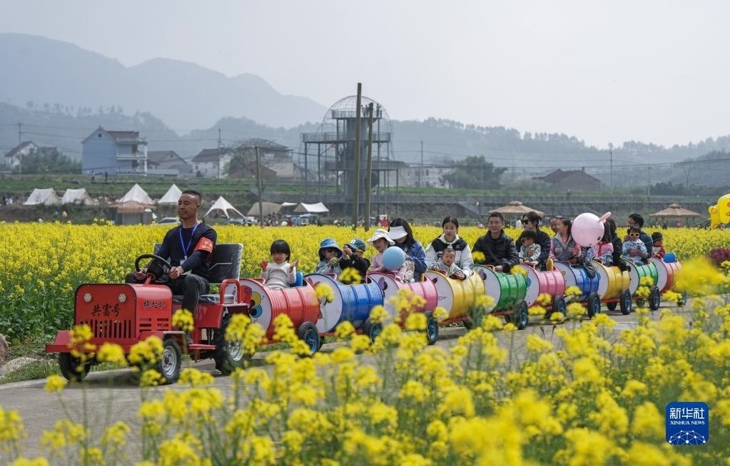 在浙江杭州臨安區(qū)青山湖街道郎家村“共富稻田”,游客乘坐田野小火車(chē)在油菜花地里感受春日美景(4月1日攝)?!肮哺坏咎铩倍ㄎ欢喙δ芴飯@農(nóng)旅綜合體,陸續(xù)打造了妙哉花園、稻田觀光道、稻田餐廳、稻田茶吧等鄉(xiāng)村旅游特色節(jié)點(diǎn),吸引城市居民前來(lái)體驗(yàn)戶外農(nóng)田生活。新華社記者 徐昱 攝