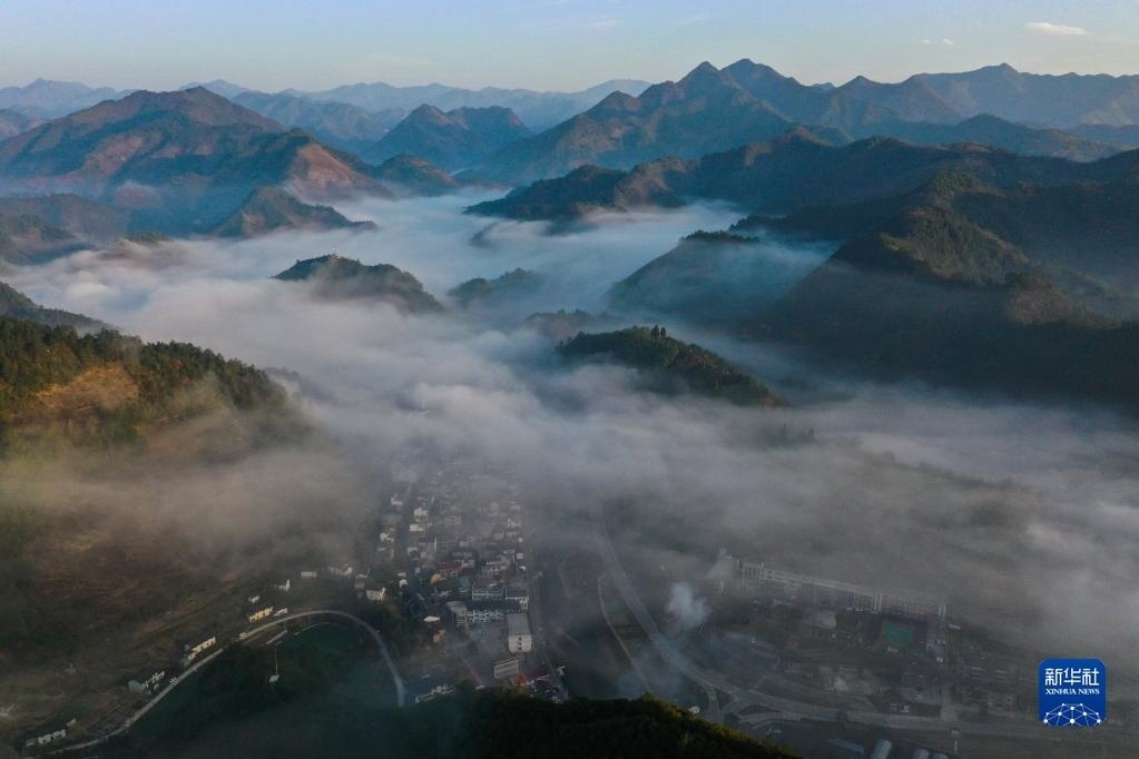 浙江杭州淳安縣屏門(mén)鄉(xiāng)風(fēng)光(無(wú)人機(jī)照片,3月10日攝)。新華社記者 徐昱 攝