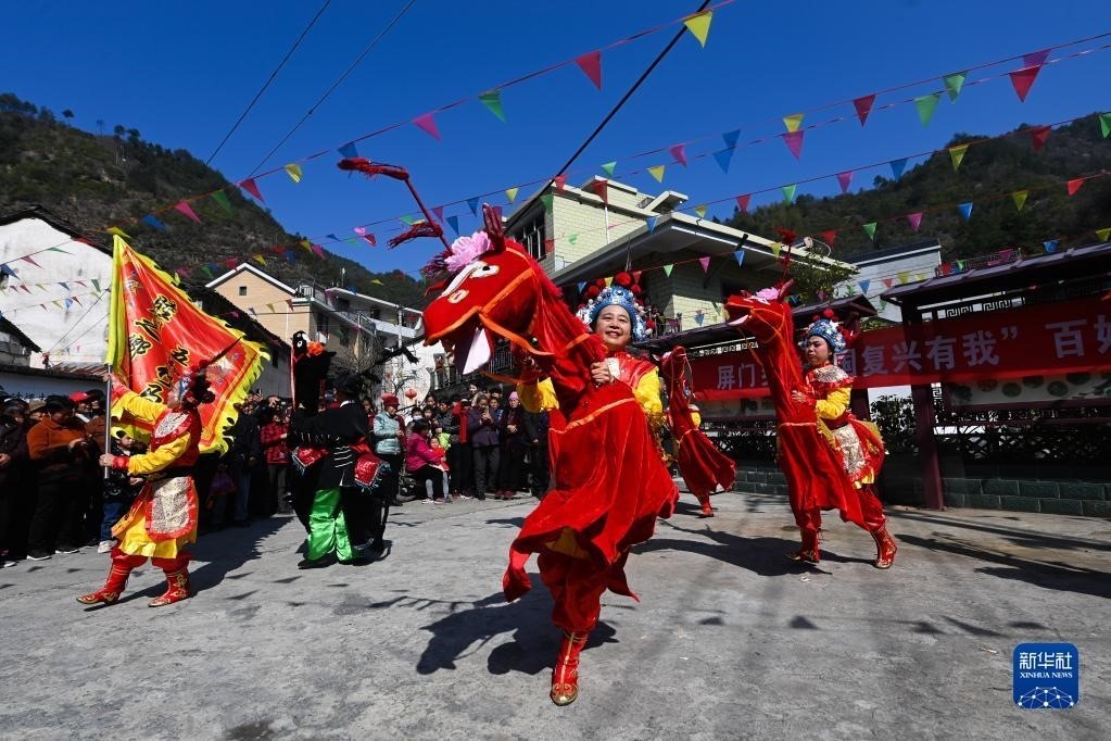浙江杭州淳安縣屏門(mén)鄉(xiāng)屏前村傳統(tǒng)廟會(huì)上的竹馬表演(3月10日攝)。近年來(lái),屏門(mén)鄉(xiāng)當(dāng)?shù)貙⒚袼妆硌?、踏青賞春、農(nóng)家特產(chǎn)展賣(mài)等融入傳統(tǒng)廟會(huì)中,成為美麗山鄉(xiāng)的春季熱鬧“大戲”,助力鄉(xiāng)村文旅融合發(fā)展和共同富裕。新華社記者 徐昱 攝