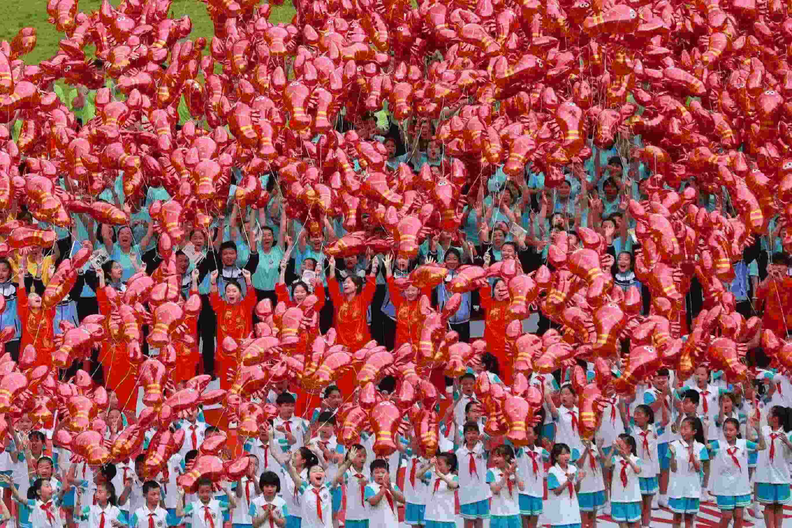 2023年6月12日,江蘇淮安,第二十三屆中國·盱眙國際龍蝦節(jié)開幕式在盱眙舉行。參加演出的演員放飛“龍蝦”氣球。 視覺中國