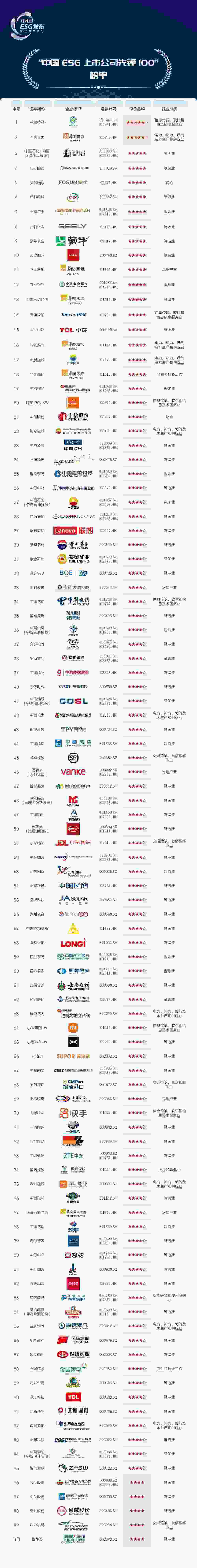 經(jīng)分析,中國移動、華潤電力、中國石化、寶鋼股份、復星國際、伊利股份、中國平安、吉利汽車、蒙牛乳業(yè)和邁瑞醫(yī)療等100家上市公司入選“中國ESG上市公司先鋒100”。