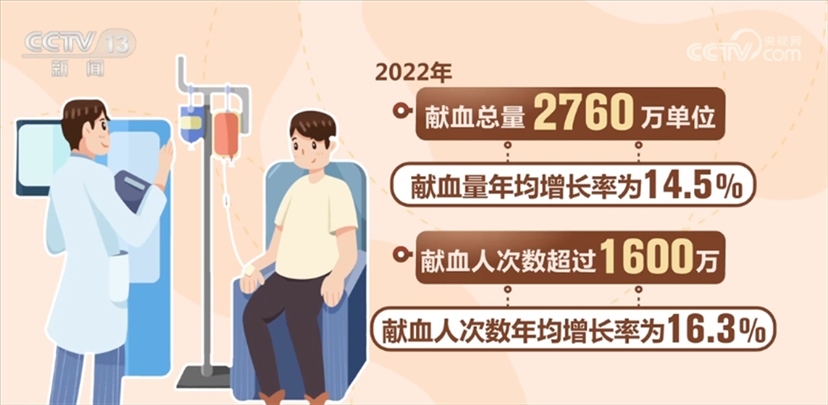 國(guó)家衛(wèi)生健康委相關(guān)負(fù)責(zé)人表示,我國(guó)無(wú)償獻(xiàn)血工作目前已形成了“政府主導(dǎo)、部門(mén)協(xié)作、社會(huì)支持、公眾參與”的格局,無(wú)償獻(xiàn)血制度全面建立,血液管理制度和規(guī)范標(biāo)準(zhǔn)體系不斷完善。全國(guó)建立了橫向到邊、縱向到底的血站采供血服務(wù)體系。全國(guó)共建設(shè)血站453家,形成以省級(jí)血液中心為龍頭、地市級(jí)中心血站為主體、中心血庫(kù)為補(bǔ)充的血站服務(wù)體系。我國(guó)血液安全保障水平大幅提升。全國(guó)無(wú)償獻(xiàn)血人次數(shù)和獻(xiàn)血量實(shí)現(xiàn)20多年持續(xù)增長(zhǎng),千人口獻(xiàn)血率由1998年的4.8提升至2022年11.5,2022年獻(xiàn)血總量2760萬(wàn)單位,獻(xiàn)血量年均增長(zhǎng)率為14.5%。2022年獻(xiàn)血人次數(shù)超過(guò)1600萬(wàn),獻(xiàn)血人次數(shù)年均增長(zhǎng)率為16.3%。今年1—5月,獻(xiàn)血人次數(shù)和獻(xiàn)血量比去年同期增長(zhǎng)7.7%和6%。