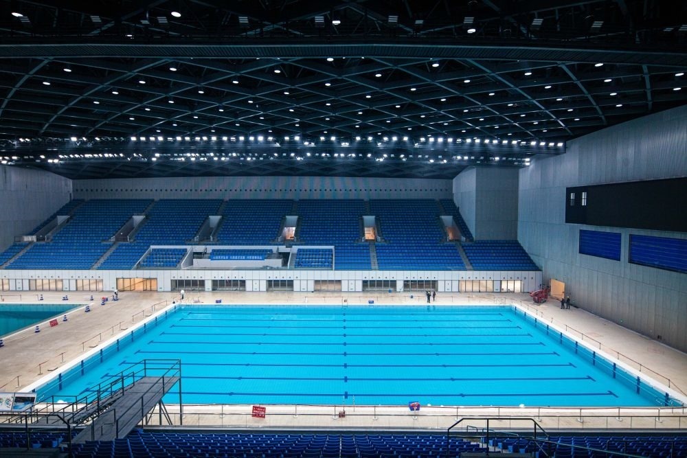 2021年4月12日拍攝的杭州奧體中心游泳館內(nèi)景。新華社記者 江漢 攝
